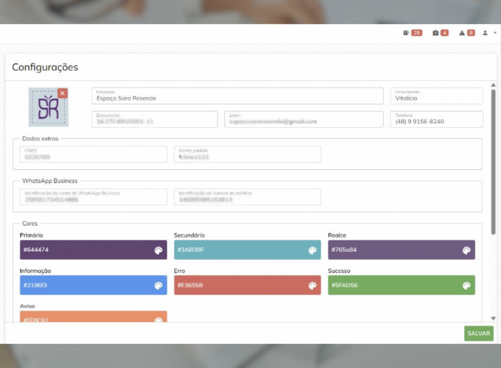 Aqui você pré-estabelece comissões dos prestadores, permissões, valores dos serviços, salas e muito mais.