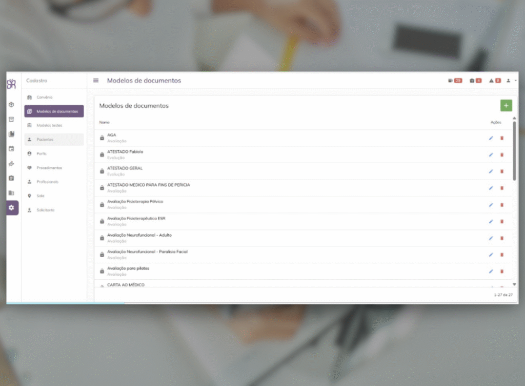 Crie seus próprios modelos e utilize-os em suas avaliações e evoluções. É possível fazer download em PDF ou DOCX.